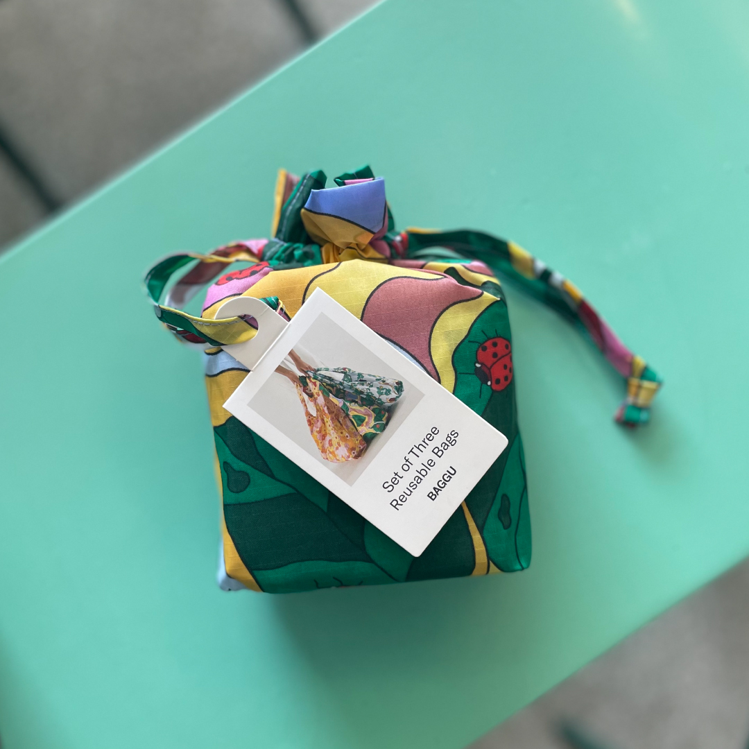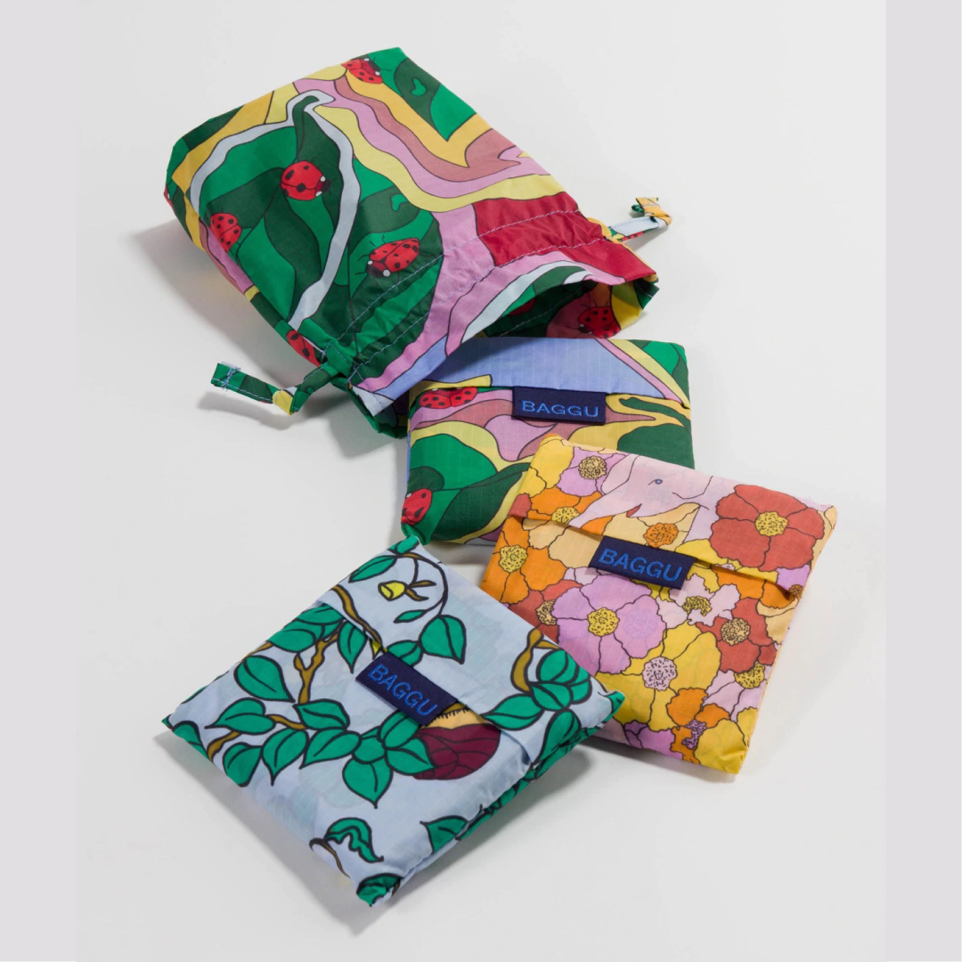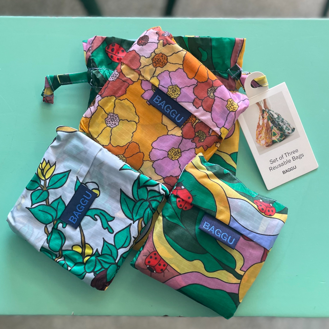 A set of Standard Baggus in a reusable drawstring pouch. Each set contains three unique prints, ideal for gifting.